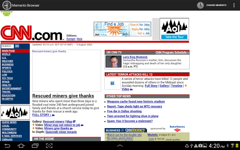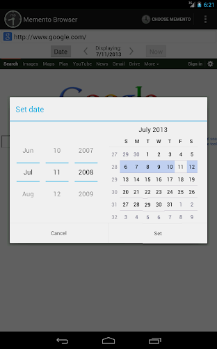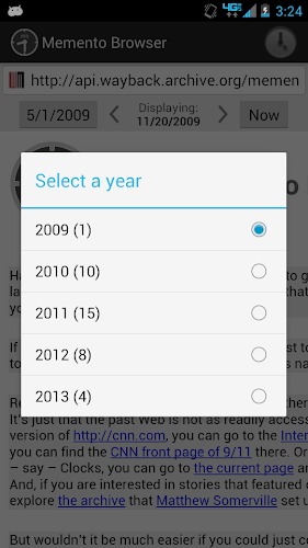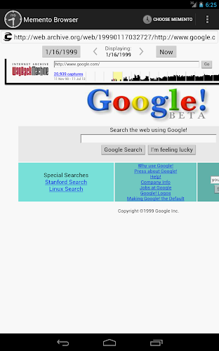 See the Web as it used to be! The Memento Browser is a web browser that allows you to see old versions of web pages. When you are viewing a web page, select a date and be automatically redirected to an archived version of the web page.Time-traveling is made possible using Memento, a modification of the HTTP protocol that adds a time dimension to the Web. Memento allows the browser to discover archived versions of a web page at archive.org, webcitation.org, and other repositories.
