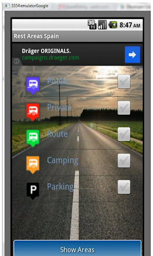 REST AREA της ΙσπανίαςΤαξιδέψτε με το φορτηγό ή το τροχόσπιτό σας από αυτή τη φανταστική χώρα, μπορείτε να βρείτε περιοχές με υπηρεσίες, τύπους ή τοποθεσίες (παραλία, ύπαιθρο, κέντρο ..)