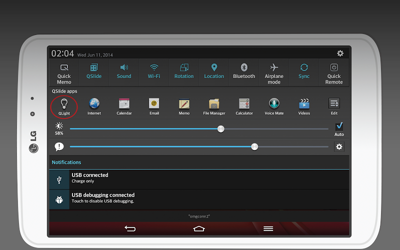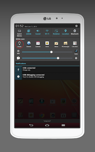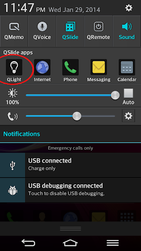 Το Qlight είναι ένα plugin για μικροσκοπικό φακό και εξαρτάται από αυτό. Το QLIGHT σας επιτρέπει να ξεκινήσετε το φως απευθείας από την οθόνη ειδοποίησης της LG παρέχοντας ένα εικονίδιο συντόμευσης στην ενότητα QSLide Apps.* Αυτό το plugin είναι διαθέσιμο μόνο σε συσκευές LG.