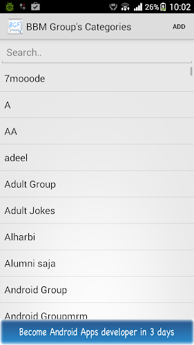 Ανάλυση Εφαρμογών Android: Group Finder For BBM Users, Που Αναπτύχθηκε Από Το Nimap Infotech LLP. Που Αναφέρονται Στην Κατηγορία Κοινωνικά. Η Τρέχουσα Έκδοση Είναι 1.0, Ενημερωμένη Στις 02/01/2014 . Σύμφωνα Με Τις Αναθεωρήσεις Των Χρηστών Στο Google Play: Group Finder For BBM Users. Επιτυγχάνονται Πάνω Από 10 Χίλια Εγκαταστάσεις. Το Group Finder For BBM Users Έχει Σήμερα 322 Κριτικές, Μέση Βαθμολογία 3.9 Αστέρια