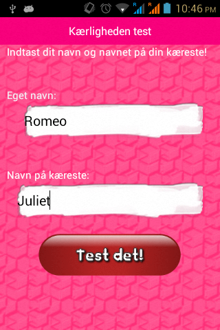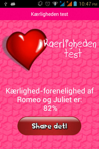Ανάλυση Εφαρμογών Android: Kærligheden Test, Που Αναπτύχθηκε Από Το Puszta Software. Που Αναφέρονται Στην Κατηγορία Κοινωνικά. Η Τρέχουσα Έκδοση Είναι 1.0, Ενημερωμένη Στις 15/02/2014 . Σύμφωνα Με Τις Αναθεωρήσεις Των Χρηστών Στο Google Play: Kærligheden Test. Επιτυγχάνονται Πάνω Από 50 Εγκαταστάσεις. Το Kærligheden Test Έχει Σήμερα 1 Κριτικές, Μέση Βαθμολογία 5.0 Αστέρια