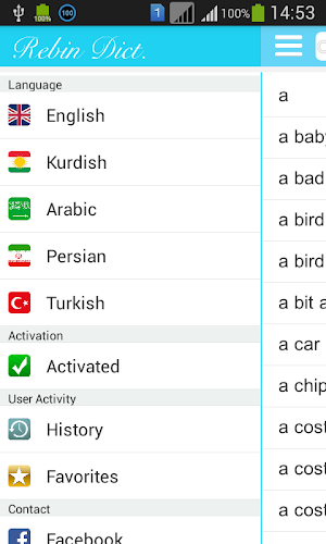 Το Rebin Dictionary είναι το πρώτο κουρδικό λεξικό που περιλαμβάνει περισσότερες από 40.000 λέξεις με ((Αγγλικά-Κουρδικά-Αραβικά-Ερσιανά-Τουρκικά)) έννοιες. Περιεχόμενο• Εκπαιδευτικές προφορές ήχου για αγγλικές λέξεις