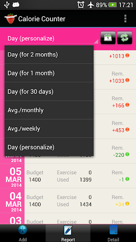 • Μια σαφής, ακριβής έκθεση που σας επιτρέπει να δείτε με μια ματιά καθημερινά, μέση εβδομαδιαία ή μηνιαία μέση πρόσληψη τροφής σας.