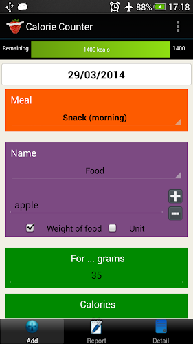 Τροφή μπορεί να μετρηθεί σε γραμμάρια, ουγγιές ou σημεία. Μπορείτε επίσης να έχουν τη δυνατότητα να καθορίσετε τα στοιχεία σε μονάδες (π.χ. ένα cookie, ένα μήλο, κλπ ..)