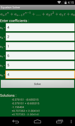 Αυτή η εφαρμογή επιτρέπει την εύρεση πραγματικών και σύνθετων ριζών μιας γραμμικής εξίσωσης βαθμού μικρότερη ή ίση με 50 και σταθερούς συντελεστές χρησιμοποιώντας τη μέθοδο Newton -Raphson.Η εφαρμογή αναπτύχθηκε από τους μαθητές Giampiero Cascarano και Francesco Colaianni υπό την επίβλεψη του Prof. Ettore Panella και Prof. Antonio Curci από το Τεχνικό Ινστιτούτο "M. Panetti" του Bari της Ιταλίας.