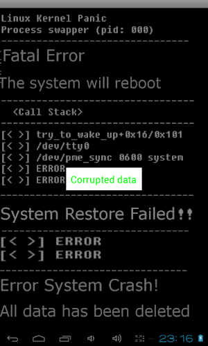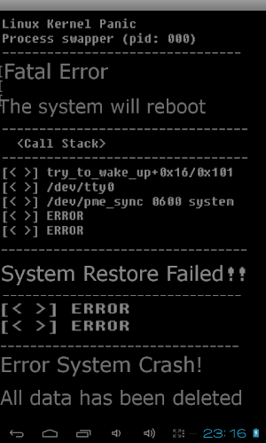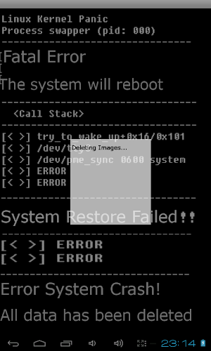 ¡Con la aplicación "La broma del virus" (virus falso) puede pretender mostrar un bloqueo del sistema obviamente falso con un mensaje falso de pérdida de datos! ¡Obviamente es solo una broma!La aplicación no instala un virus y no perderá datos, ¡pero solo simula una pantalla de bloqueo! La aplicación está diseñada para hacer bromas a amigos, parientes, familiares, su novia, bromas de su novio, etc.