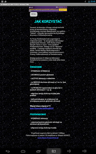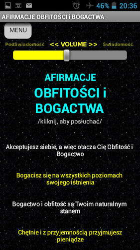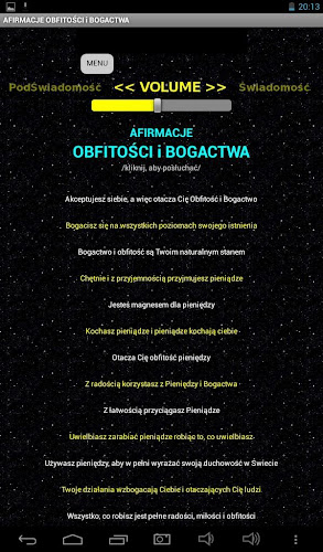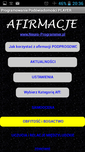 devant vous un outil qui vous permettra de: - sélectionner afirmację- écouter son podkładem choisi- vous entendez des affirmations de votre musique préférée-subliminal - affirmation écouter en arrière-plan votre musique préférée słyszalnościdostępne en dessous des catégories d'affirmation : haute estime de soi (haute estime de soi), abondance et richesse, assertivité et relations interpersonnelles, apprentissage efficace, santé, travail et gagnez de l'argent, la créativité, le pardon, la conscience en dehors du corps, le sens de la vie, bógjak utilisez délibérément - définissez les paramètres du son de fond (si vous le souhaitez) - votre affirmation -