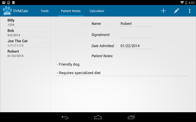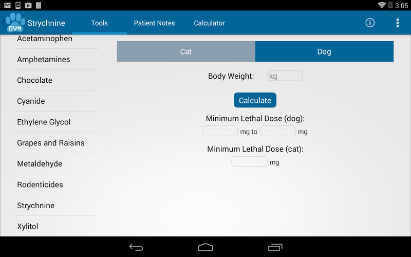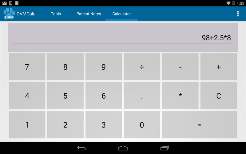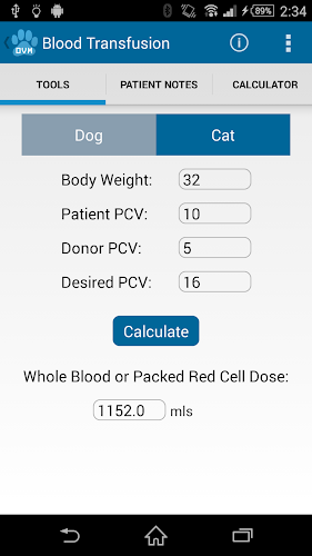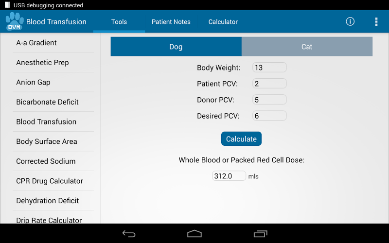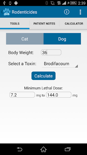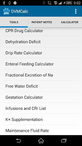 DVM CALC पशु चिकित्सकों, पशु चिकित्सा चिकित्सा छात्रों और पशु चिकित्सा तकनीशियनों के लिए उपलब्ध सबसे व्यापक छोटे पशु पशु चिकित्सा कैलकुलेटर है। पशु चिकित्सा विशेषज्ञों और आपातकालीन पशु चिकित्सकों के एक समूह द्वारा विकसित, इस एप्लिकेशन में 26 व्यावहारिक कैलकुलेटर, 15 विशिष्ट निरंतर दर जलसेक कैलकुलेटर और 10 विषाक्तता कैलकुलेटर शामिल हैं। प्रत्येक व्यक्तिगत कैलकुलेटर में गणना की व्याख्या करने के लिए एक सूचना पत्र शामिल है। एक उपयोगी "नोट्स" पृष्ठ भी शामिल है, जो उपयोगकर्ता को कई रोगियों (300 शब्दों/रोगी तक) पर नोटों को दर्ज करने, सहेजने और संपादित करने की अनुमति देता है। एक विशिष्ट खंड रोगी के नाम, संकेत और प्रवेश तिथि के लिए शामिल है। एक बुनियादी संख्यात्मक कैलकुलेटर को भी आवेदन के भीतर शामिल किया गया है ताकि उपयोगकर्ता को अतिरिक्त गणना करने की अनुमति मिल सके, जब आवश्यक हो, एक अलग कैलकुलेटर खोलने के लिए आवेदन को बंद किए बिना।dvm calc में शामिल हैं: