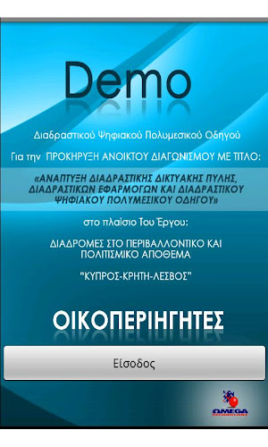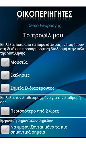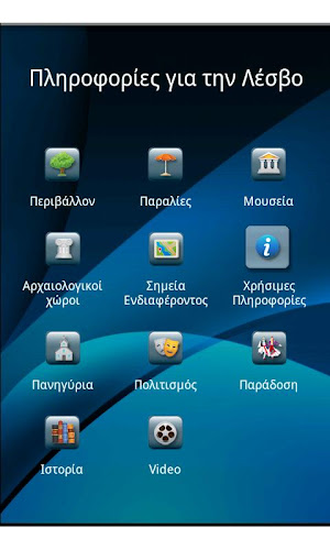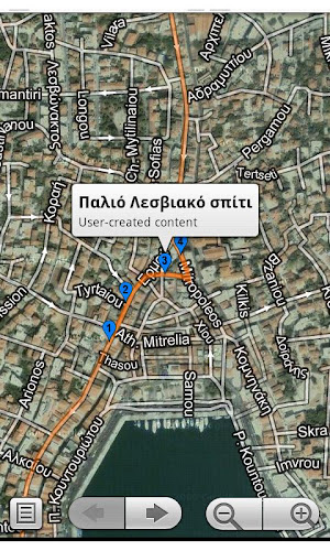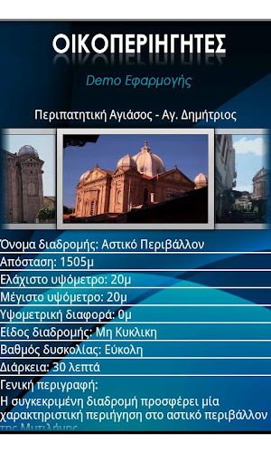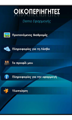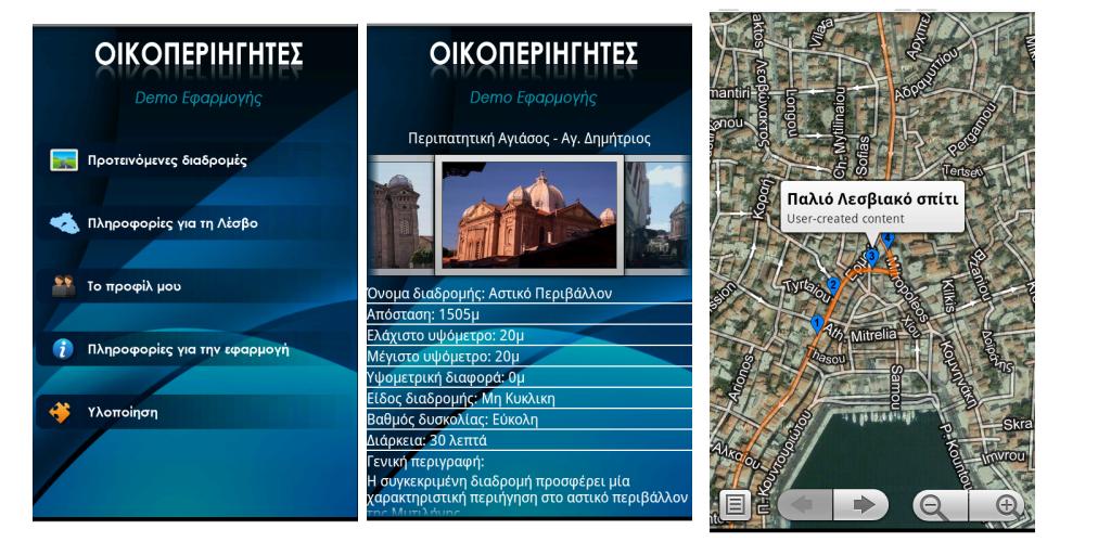 A megvalósítás az interaktív multimédiás útmutató okostelefonja (Android) megjelenítési példája a Lesvou régiójában. A kiválasztás [ajánlott útvonalak] a Lesvosban javasolt útvonalakat mutatja be.Az egyes útvonalakhoz vannak olyan részletek, mint például az útvonaltípus, a nehézség, a szükséges idő stb. Lehetőség van arra, hogy a mytilini -ben specifikus nyomon követhesse a kívánt érdeklődés kategóriákat.