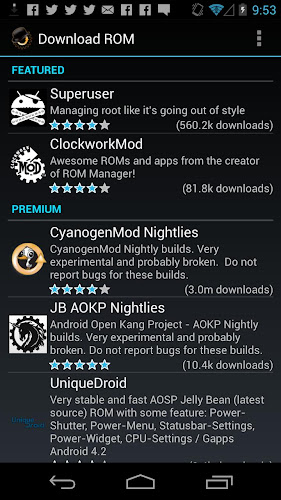 ROM Manager adalah aplikasi yang harus dimiliki untuk pengguna root Android. (lebih dari 10 juta unduhan dan penghitungan!)* Flash pemulihan Anda ke pemulihan ClockworkMod terbaru dan terhebat.
