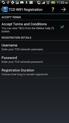 Trinity College staff can use this app to register their android device on the Trinity Staff Wi-Fi service.The app asks you to manually enter details such as your MAC (Wi-Fi) Address, Duration, username. Additonally, Device Name & Android Version are automatically extracted.