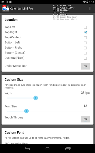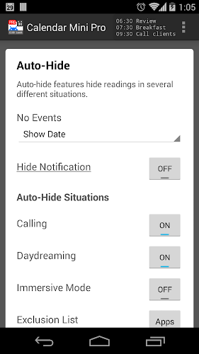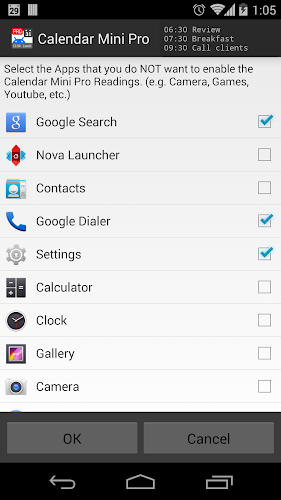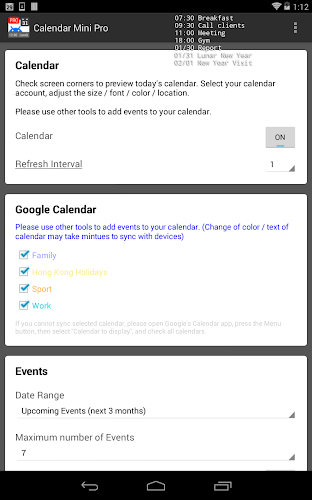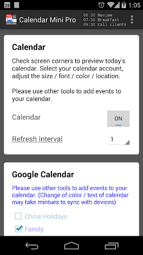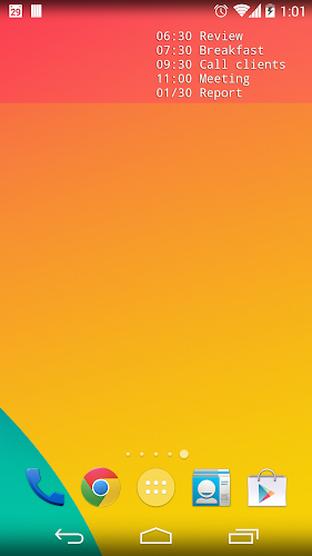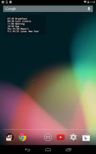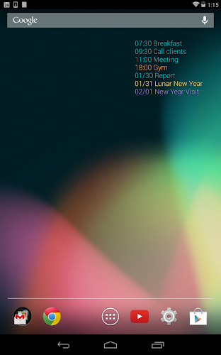 We like Google Calendar, because it can be used on any platforms. This app add your Google Calendars to your screen. It displays today's events, today's unfinished events, events in next 24 hours, upcoming events in next 3 months. It's highly configurable. You can adjust the color / font size / font family / width / transparency / position / color for your calendar.It is always available on screen so that you will always see your schedule, and prepare for the future. This is a time management tools for every Google user.