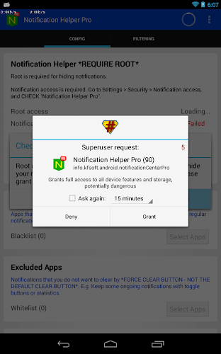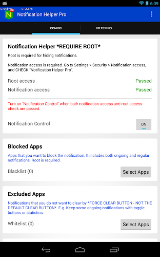 With the root access, you can now clear all ongoing notifications, as well as regular notifications. You can also blacklist or whitelist apps, so that you do not need to care about their notifications anymore. You can even define simple filtering rules to automatically dismiss some notifications.