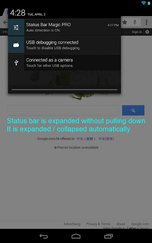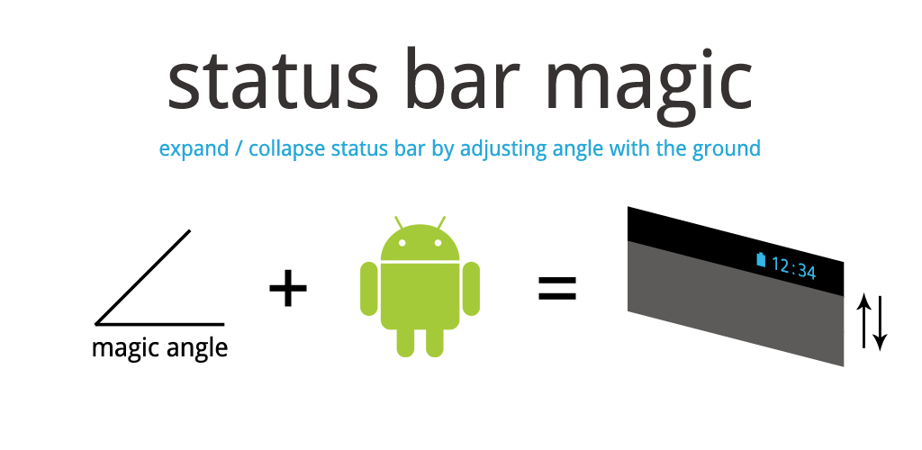 This expand and collapse the status bar (or notification center) automatically, by detecting phone's back cover angle with the ground. Users can see latest information of their phone, without pulling down the status bar by fingers. It detect of angle with the ground, and trigger expansion and collapse of the status bar.Because of the large screen size, pulling down the status bar could be tedious and difficult sometime. It can also help you to keep your screen clean because auto pull-down do not require touching of screen. If you have a large screen, you will love this app.