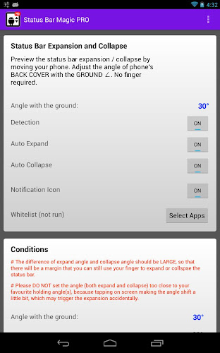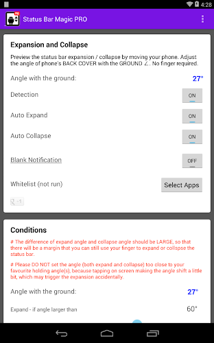 This expand and collapse the status bar (or notification center) automatically, by detecting phone's back cover angle with the ground. Users can see latest information of their phone, without pulling down the status bar by fingers. It detect of angle with the ground, and trigger expansion and collapse of the status bar.Because of the large screen size, pulling down the status bar could be tedious and difficult sometime. It can also help you to keep your screen clean because auto pull-down do not require touching of screen. If you have a large screen, you will love this app.