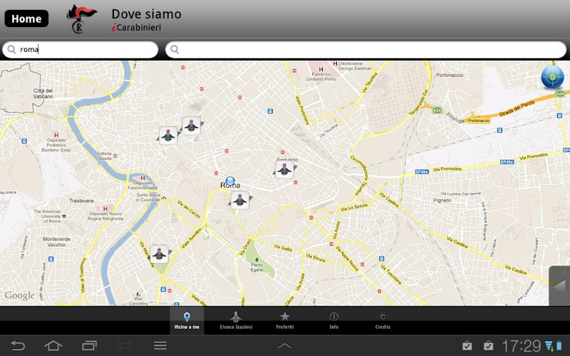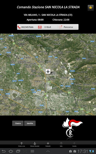 - "Dove Siamo", per consentire al cittadino di conoscere l'ubicazione delle caserme dell'Arma più vicine (5, 10 o 15) rispetto a un punto dallo stesso indicato o dalla sua posizione geografica, automaticamente rilevata dai dispositivi. Una mappa interattiva aiuta l'utente nella ricerca del percorso più breve. Il cittadino, inoltre, attraverso un'intuitiva interfaccia grafica può entrare immediatamente in contatto, telefonico o via e-mail, con il Comando desiderato. In sintesi, le principali funzioni offerte sono: