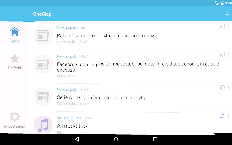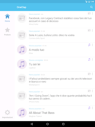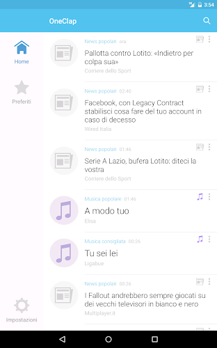 you want to discover and enjoy new music, or stay updated with the popular news? oneclap allows you to receive relevant information currently available based on your preferenze.contenuti: • Music • News • outputs videogamesolo the important things: oneclap is not simply an aggregator, will proposeonly interessanti.intelligente content: appreciating a piece of music, an algorithm will advise subsequent tracks based on your gusti.scopri: if you do not want to wait for the advice of the application you can discover new content browsing through the correlati.clapmeter elements: each element is characterized