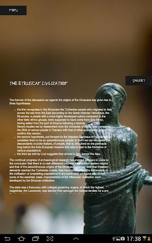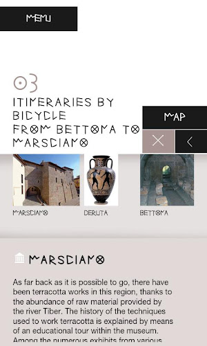 In Umbria, there are numerous traces of Etruscan towns and necropolises. Over the centuries casual discoveries and organised excavations have revealed an extraordinary number of artefacts of every kind - sculptures, paintings and products of the minor arts - coming from the schools of art and the craft workshops of Etruria. The idea that their language is indecipherable has created an aura of mystery and glamour around the Etruscan civilization.In this application you will find