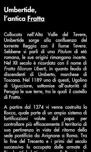 Collocata nell’Alta Valle del Tevere, Umbertide sorge alla confluenza del torrente Reggia con il fiume Tevere. Sebbene si parli di una Pitulum di età romana, le sue origini rimangono incerte. Nel XII secolo è ricordata con il nome di Fratta filiorum Uberti, in quanto feudo di discendenti di Umberto, marchese di Toscana. Nel 1189 uno di questi, Ugolino di Uguccione, sottomise all’autorità di Perugia le sue terre, tra le quali il castello di Fratta.