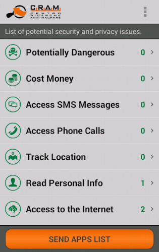 CRAM App Analyser is a "privacy advisor", which allows you to check the apps that may represent potential issues to YOUR security and to YOUR privacy.Once launched the scan, the apps will be divided into: