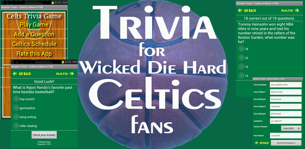 The app has access to even more great Celtics Trivia questions! We also added a new feature to pick a random starting question number, and show the All Time Scores, when your are in the Play Game Mode hit the phone's Menu button. We now keep a running score. GO CELTICS!!!