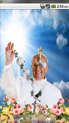 Questa carta da parati animata del Papa Francesco ti consente di interagire con l'immagine che aggiunge il simbolo dello Spirito Santo, un Pidgeon e una colomba. Quando si preme sulla mano Francis, i Pidgeon iniziano a volare sullo schermo e quando si preme sugli uccelli si animano con una croce in movimento.Avere questo bellissimo sfondo sul tuo telefono ora.