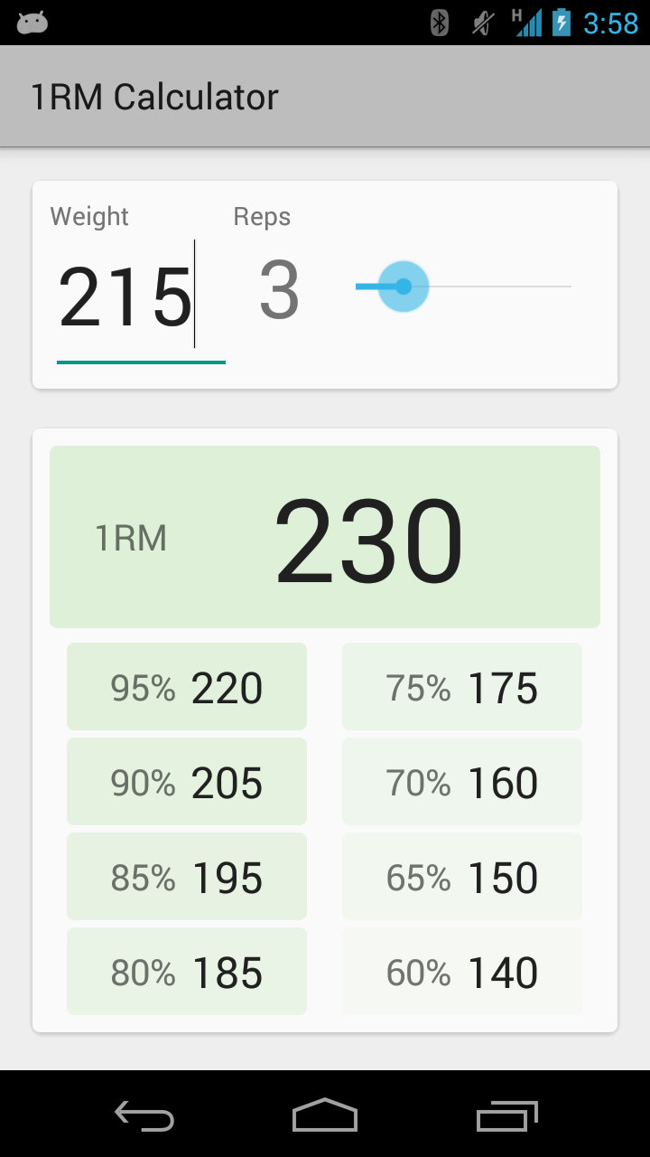 App semplice e utile di sollevamento pesi/fitness per stimare 1RM (un massimo di ripetizione) dato un peso e un numero di ripetizioni.: