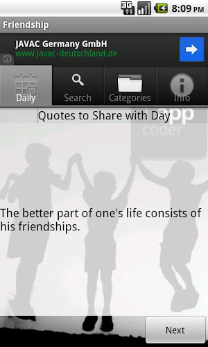 Analisi E Revisione Delle App Android: Friendship Quotes and Messages by TapCoder, Sviluppato Da TapCoder. Elencato Nella Categoria Lifestyle. La Versione Corrente È 2.8, Aggiornata L' 04/07/2013 . Secondo Le Recensioni Degli Utenti Su Google Play: Friendship Quotes and Messages by TapCoder. Ottenuto Oltre 5 Mille Installazioni. Friendship Quotes and Messages by TapCoder Ha Attualmente Recensioni 16, Valutazione Media 4.5 Stelle