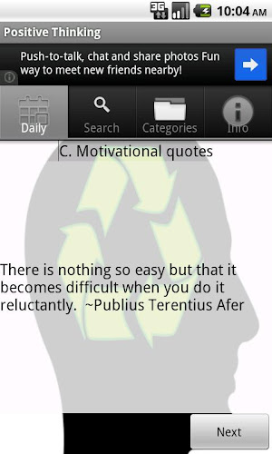 Analisi E Revisione Delle App Android: Positive Thinking. The Key to, Sviluppato Da TapCoder. Elencato Nella Categoria Lifestyle. La Versione Corrente È 1.5, Aggiornata L' 21/02/2013 . Secondo Le Recensioni Degli Utenti Su Google Play: Positive Thinking. The Key to. Ottenuto Oltre 5 Mille Installazioni. Positive Thinking. The Key to Ha Attualmente Recensioni 26, Valutazione Media 3.7 Stelle