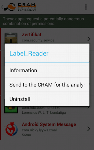 CRAM App Analyser svolge la funzione di “consulente della privacy”, permettendo di visualizzare le app che possono rappresentare potenziali problemi alla TUA sicurezza e alla TUA privacy.Una volta lanciata la scansione, le app verranno divise in:
