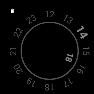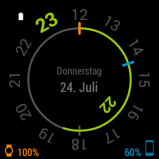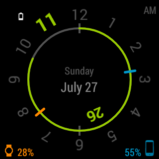 Informazioni sulla batteria viene visualizzato in modo discreto: Il livello della batteria dell'orologio viene visualizzato sul lato sinistro del cerchio, mentre il livello della batteria del dispositivo Android guidata viene visualizzata a destra. Poiché il livello della batteria diminuisce, un piccolo indicatore barra si muove dall'alto verso il fondo del cerchio.