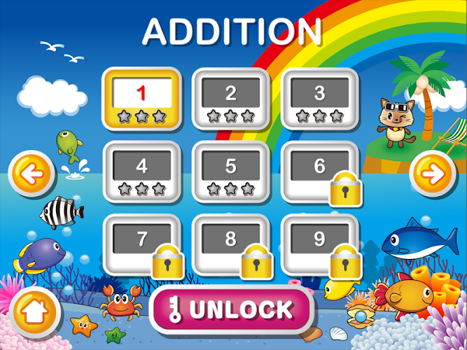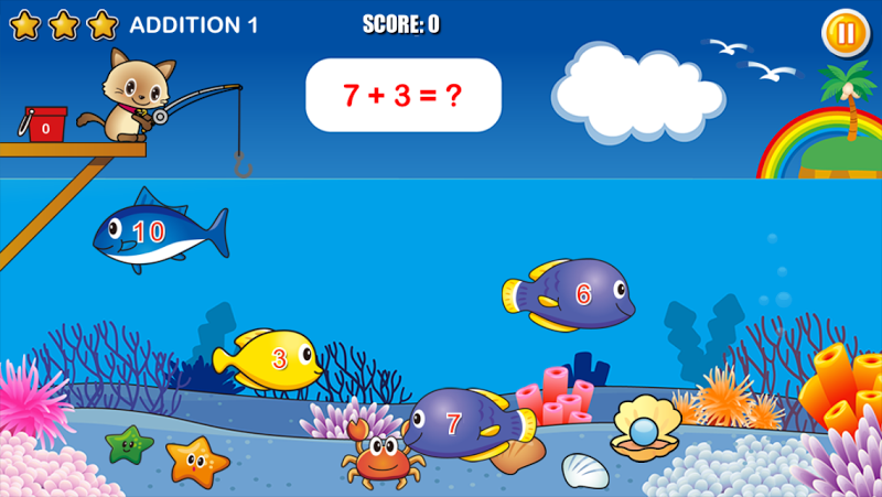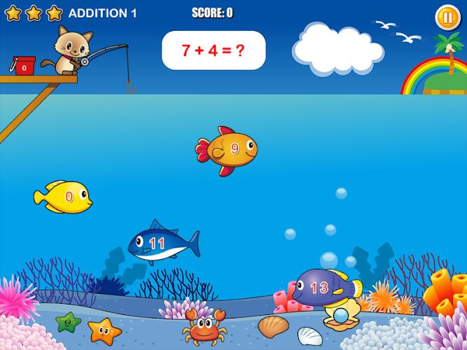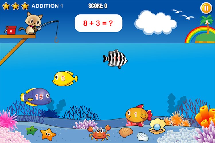 魚を触れてそれらを捕まえます。猫は正しい答えで魚だけを食べます。