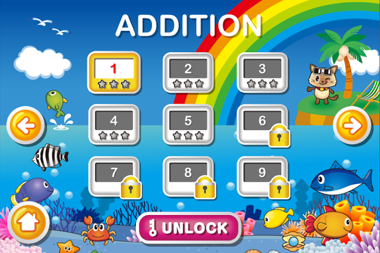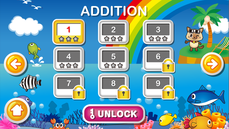 1の再生方法。書かれた数の正解で魚に触れてください。