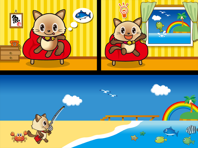 ■ゲームについて{#}あなたの猫は空腹で、海辺で魚や釣りをしたいです。{#}魚を触れてそれらを捕まえます。猫は正しい答えで魚だけを食べます。{#}...