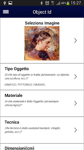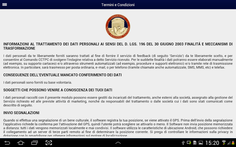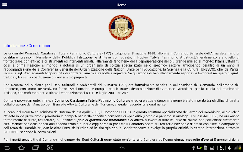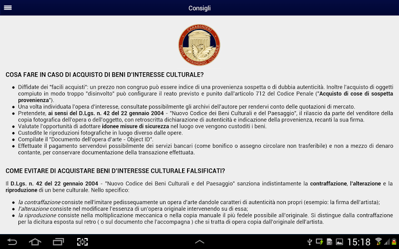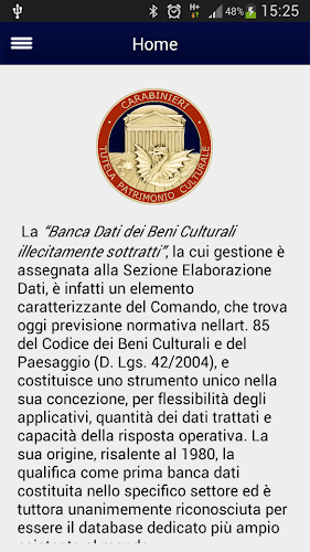 itpc アプリケーションは、文化的関心の高いコンテンツをモバイル デバイスで利用できるようにするために作成されました。現在、モバイル デバイスではさらに diffusi.itpc は、文化遺産被害に対する犯罪との戦いに貢献することができ、失われた芸術作品の回復を目的とした文化遺産保護における警察の捜査活動をサポートできるため、前例のないものであり、テレマティクス機能に関する最高レベルのポータビリティと公開情報を確保しています。このアプリケーションは次のサービスを提供します: 1. 研究速報の閲覧: 盗まれた芸術作品の速報は、cc tpc コマンドによって作成され、武器の一般コマンドによって発行される出版物であり、時間の経過とともに盗まれた最も重要な作品が含まれています。