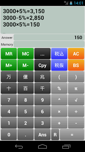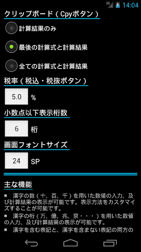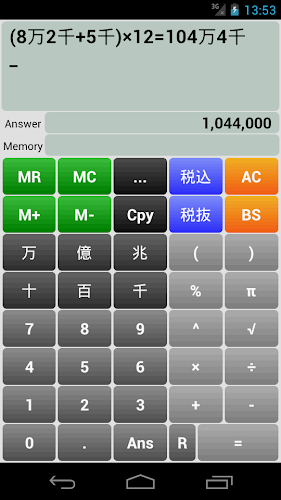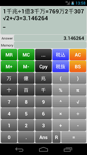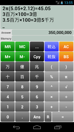 ■ 漢字の桁(万、億、兆、京・・・)を用いた数値の入力、及び計算結果の表示が可能です。