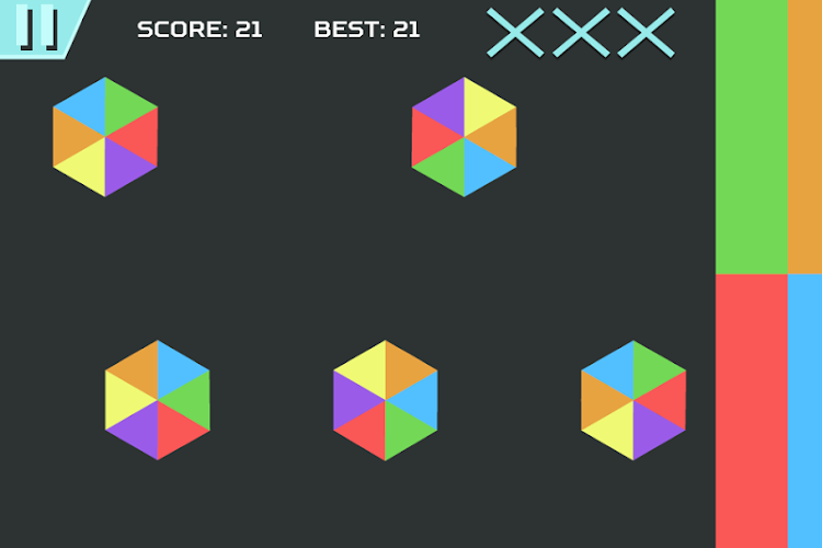 gohexago はスマートフォンやタブレット向けのシンプルでエキサイティングなアクション ゲームです。- この新しくエキサイティングなアクション ゲーム gohexago で色をすばやく合わせましょう!