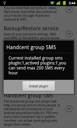 이것은 Handcent SMS용 그룹 SMS 플러그인입니다. 이를 설치하고 Handcent 설정->Handcent 서비스->Handcent 그룹 SMS에서 활성화된 상태를 확인하기만 하면 됩니다. Handcent SMS는 활성화된 플러그인을 자동으로 관리합니다.이 플러그인은 그룹 SMS를 보낼 때 Android 제한을 확장하는 데 도움이 되므로 더 많은 그룹 SMS를 보낼 수 있습니다. 모든 플러그인은 시간당 100개의 SMS를 추가합니다.