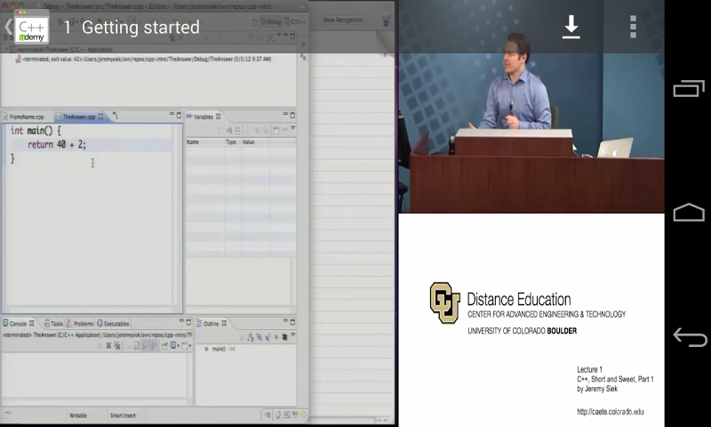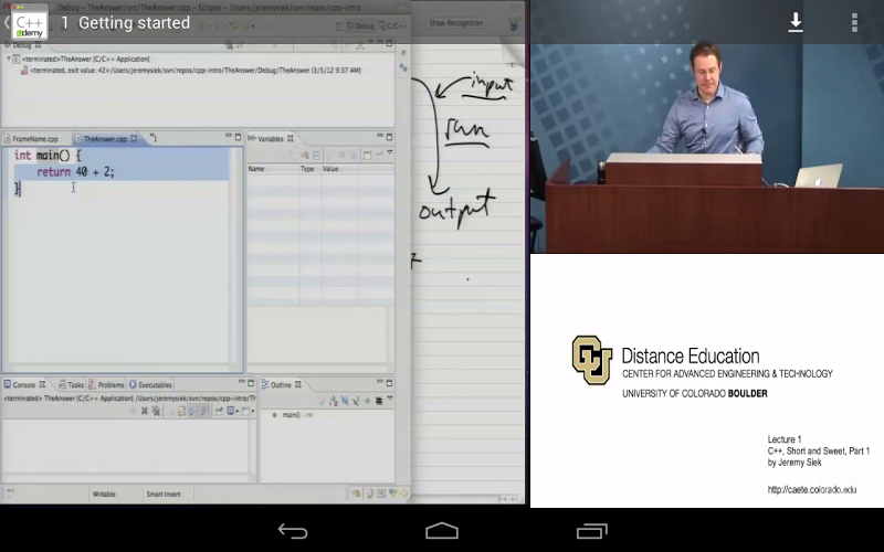 이 과정은 콜로라도 대학 교수 인 Jeremy Siek가 가르치는 C ++에서 프로그램을 작성하기 시작하는 초보자를위한 것입니다. C ++에 대한 사전 지식은 가정되지 않습니다. 이 과정은 Andrew Koenig와 Barbara E의 C ++ 가속화 된 훌륭한 교과서를 기반으로합니다. 음매.교과서와 마찬가지로 코스는 문자열, 벡터 및 목록을 포함한 C ++ 표준 라이브러리를 해결하고 사용하는 데 빠르게 다이빙합니다. 일상적인 프로그래밍에 필요한 C ++의 일부를 가르치는 데 중점을 둡니다.