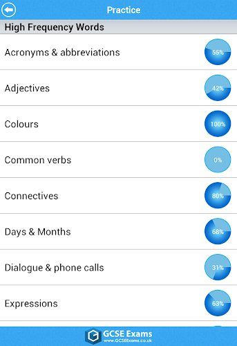 지능적으로 설계된 퀴즈 시스템으로 어휘를 테스트 할 수 있습니다. 모든 단어는 주제로 분류됩니다. 연습 모듈을 사용하면 아직 해결하지 않은 질문이나 질문에 잘못 답변 할 수 있습니다. 각 테스트가 끝나면 점수를보고 답변을 검토 할 수 있습니다. 파이 차트는 현재 진행 상황을 보여줍니다.