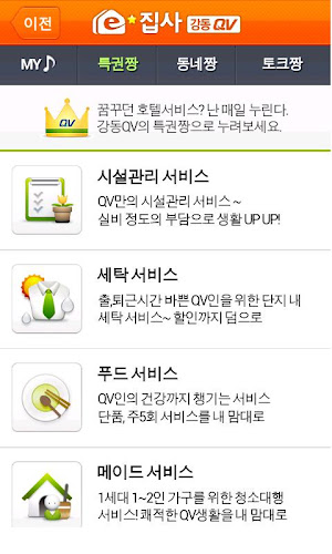 이집사 서비스는 도시형생활주택 강동QV 입주민들의 특권 서비스로관리비 조회 및 생활편의정보, 커뮤니티 서비스를