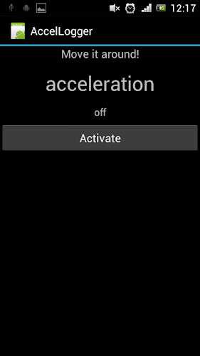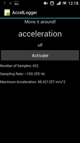 vienkārša lietotne, kas reģistrē akselerometra datus ārējā atmiņā (parasti mapē /sdcard/accellogger/) kā csv failu (laika zīmogs, absolūtais paātrinājums un paātrinājums x, y un z asīs -> atdalītas ar cilnēm), kā arī ļauj skatīt absolūtā paātrinājuma vērtību diagrammā tieši tālrunī. xperia ray (skatiet papīra atsauci zemāk). tomēr citiem tālruņiem (piemēram, samsung galaxy sii) var būt ierobežots mērījumu diapazons, tāpēc tas ar tiem nedarbojas. bet hei, šī lietotne ir bezmaksas, tāpēc vienkārši lejupielādējiet un izmēģiniet to savā tālrunī! varbūt atradīsi tam citus foršus pielietojumus?! tad, lūdzu, dariet man ziņu. ;-)Ja veiksmīgi veicat zinātnisku darbu ar šo lietotni, lūdzu, citējiet tālāk norādītās atsauces: