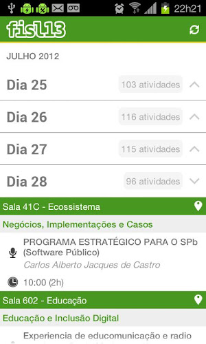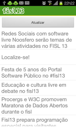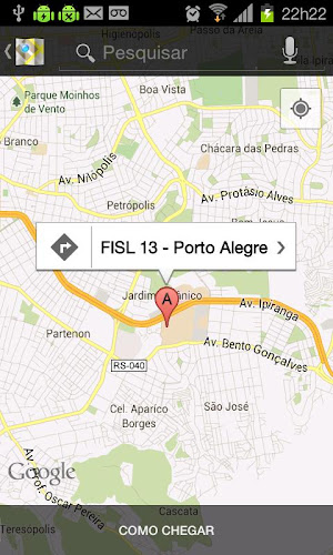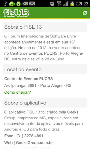 the International Free Software Forum in its 13th now has a mobile app for Android 2.2 developed by geeks group, which specializes in the application ramo.através you can access the grid of the event, news, radio and tv free software.Moreover, it is possible to trace directions (google maps) based on its location to the PUCRS event center and view the map of stands and activities of the event.