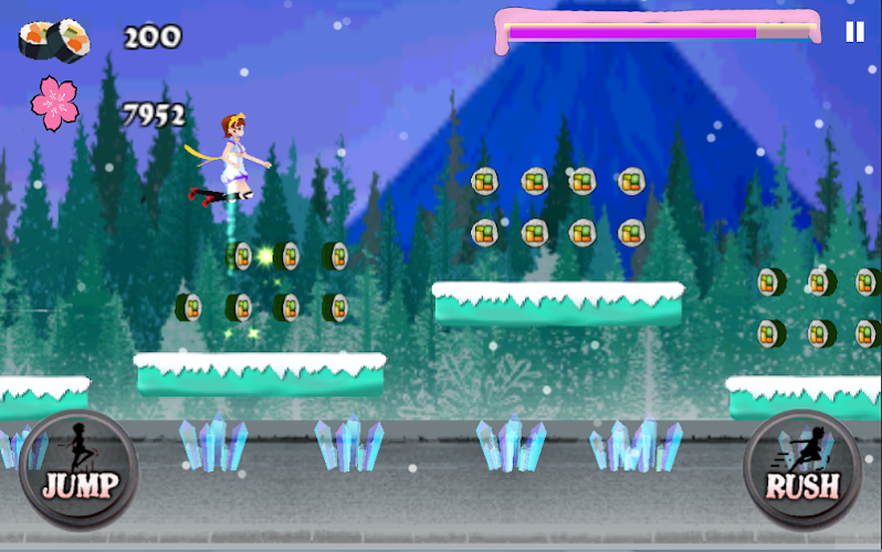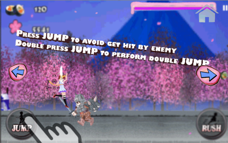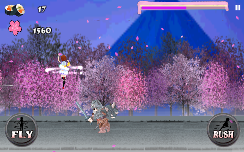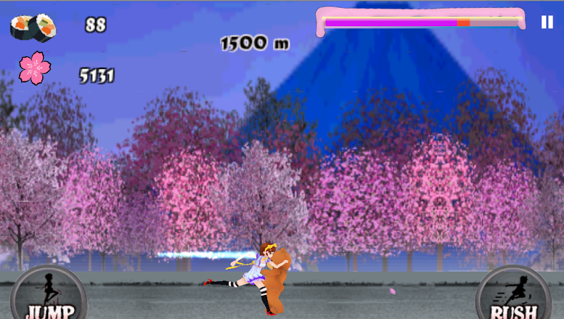 In the game, Harumi runs along the road to collect the sushi for her daily life. But there are many obstacles like ninja, warrior and bear that try to block Harumi from collecting more sushi. So, you must help Harumi to overcome all the obstacles and achieve the highest score.Just use JUMP button to jump over the obstacles and RUSH button to collect sushi or break the obstacles. Don’t forget to double press the JUMP button to unlock FLY button! You will find out it is more FUN!!