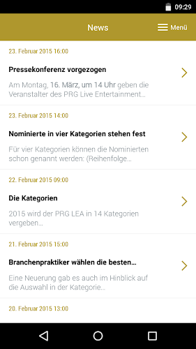 the official app for prg live entertainment award 2015 on 14 April in Frankfurt's Festhalle.a total of 14 lea-trophies go to successful promoter, artist manager, concert agents and indoor and provides club operator of the event year 2014.die app news around the ceremony and this year's nominations.