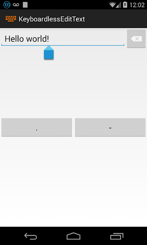 This apps demonstrates a working version of KeyboardlessEditText, which is open source on GiHub: https://github.com/danialgoodwin/android-widget-keyboardless-edittextThe purpose of this keyboardless EditText is to allow regular use of the input box without a soft keyboard showing up. This allows custom buttons on the screen to interact with the field without having to define a full custom keyboard yourself.