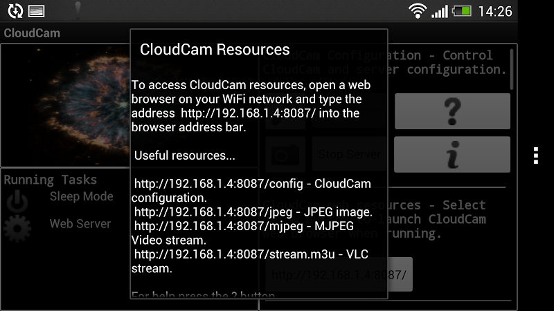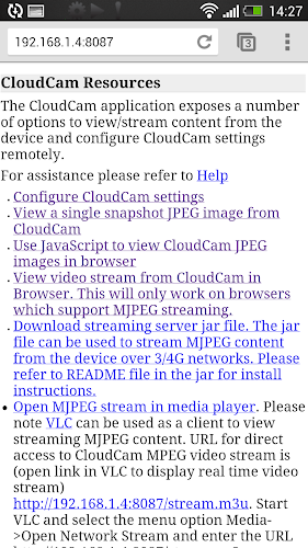 11. Free streaming server supports automatic presentation of real time streaming video content from the handset to waiting streaming players like VLC. Multiple streaming servers can run in parallel on a PC,Mac or Linux server servicing multiple CloudCam device allowing multiple CloudCam devices can be viewed from a single source.