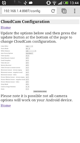 8. Secure remote control from anywhere in the world. The application can be controlled remotely using email to switch ON/OFF CloudCam features and change camera settings (i.e. zoom, turn camera flash light ON/OFF, adjust picture quality,switch ON Snapshot/Video mode and many more).