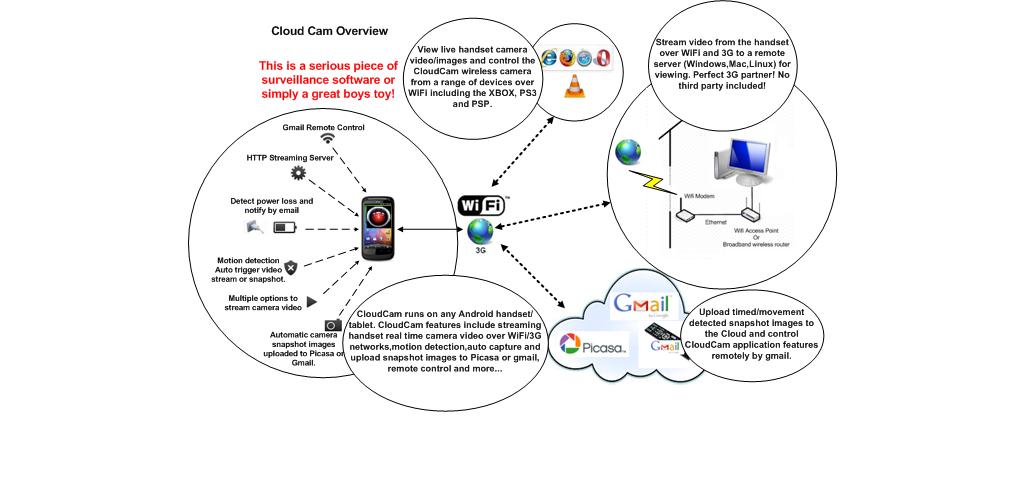 3. Real time video/audio streaming over WiFi and 3G networks. Either connect to the device over WiFi and use VLC to view content or use the free streaming server (included as a download from CloudCam) to stream real time camera video from the device over 3G. No third party included!