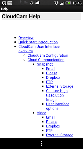 4. Capture scheduled camera images/recordings and upload to the Cloud or save to SD card. Configure application to capture and send camera images to email, Picasa, Dropbox, or FTP.